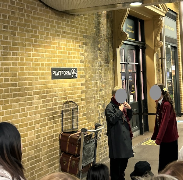 駅構内には9¾番線の撮影スポットがあり、壁に突き刺さったトランク付きカートと写真が撮れます。